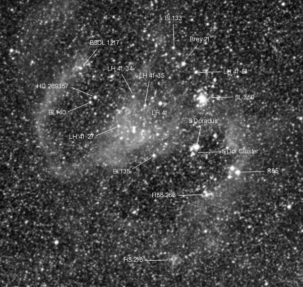 LBV – R85 (mag 10.8); Wolf-Rayet star Brey 21 (mag 11.3), and an incredible 8 O-type stars: LH 41-51 (mag 12.4), BI 133 (mag 13.0), BI 135 (12.6), LH 41-35 (mag 13.4), LH 41-34 (mag 13.2), LH 41-27 (mag 12.9), HD 269357 (mag 12.1), B140 (mag 13.1).